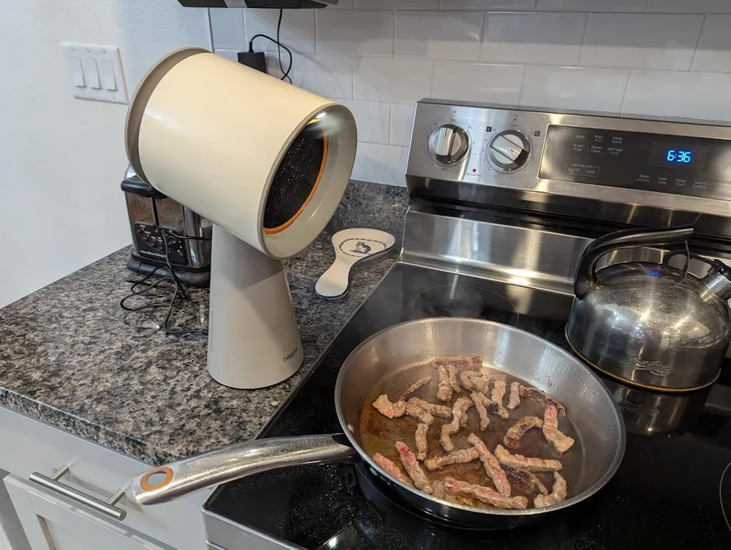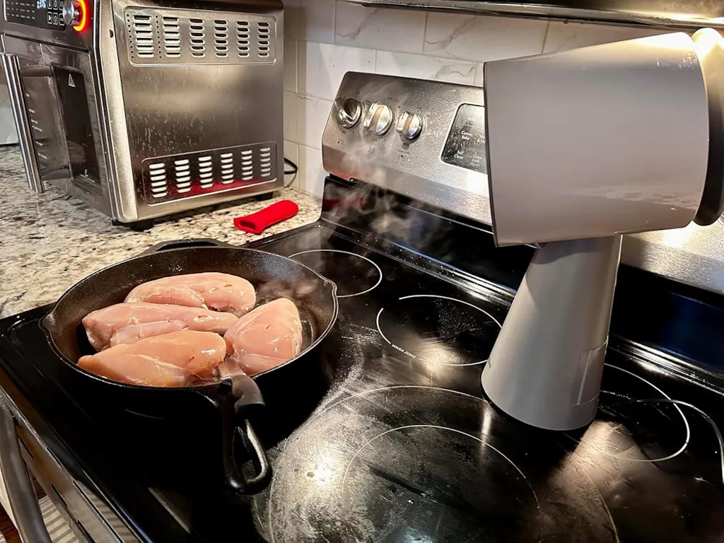 Works really well. Our above the stove microwave doesn’t do anything at all as far as a vent, and I got this to hopefully cut down on the room filling with smoke from cooking on cast iron and all the smells that linger as well. It is working very well so far. Nothing really collects in the oil collection tray but the filter seems to catch a lot, so I’m glad a replacement was sent for when it’s time. It does need to be close to the food in order to suck up the smoke, and it’s pretty loud, but I don’t see how you’d get away from that no matter what. Generally happy with ease of use and suction. So far so good!